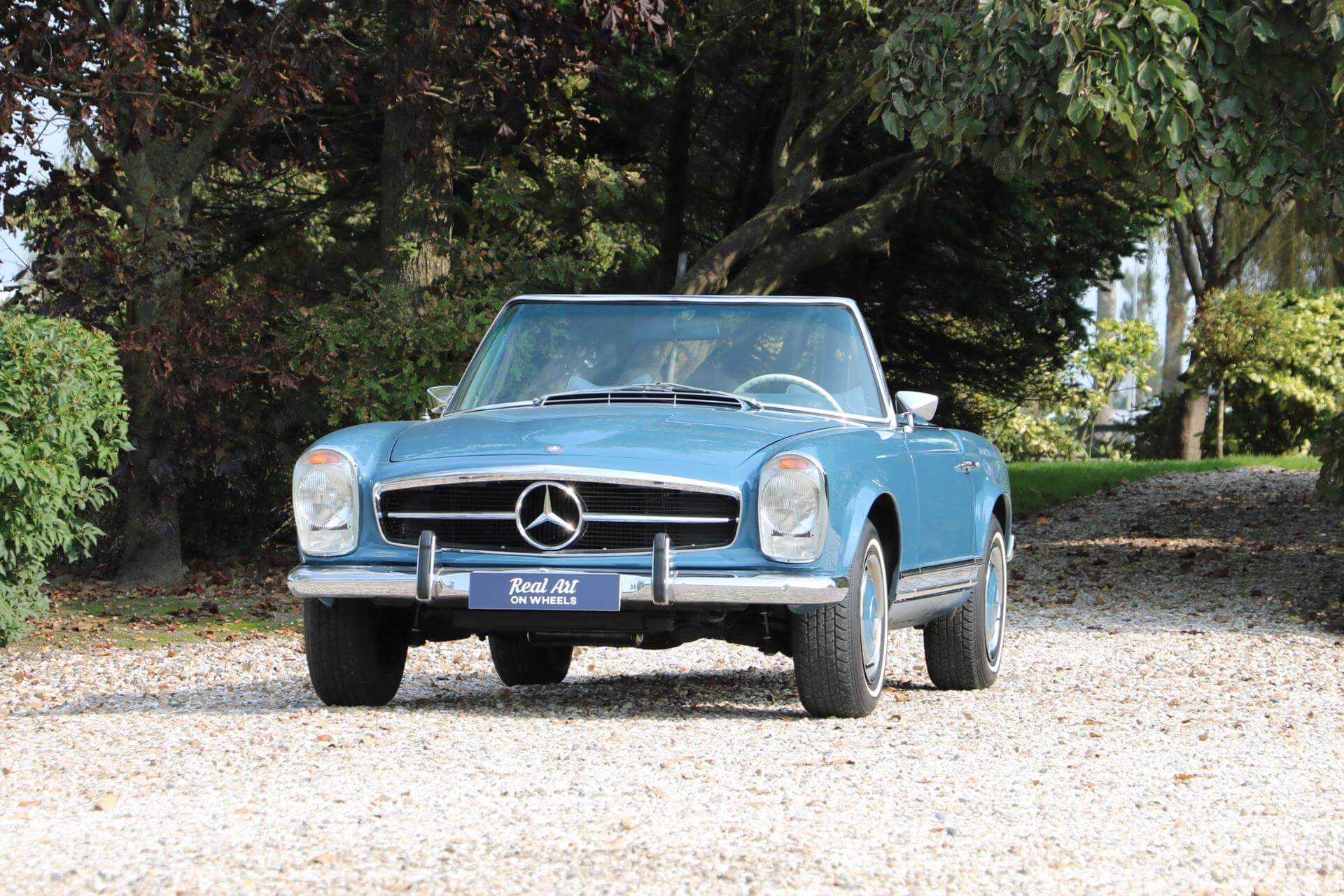 All models were equipped with an inline-six cylinder engine with multi-port fuel injection. The bonnet, boot lid, door skins and tonneau cover were made of aluminum to reduce weight. The comparatively short and wide chassis, combined with an excellent suspension, powerful brakes and radial tires gave the W 113 superb handling for its time. The styling of the front, with its characteristic upright Bosch “fishbowl” headlights and simple chrome grille, dominated by the large three-pointed star in the nose panel, paid homage to the 300 SL roadster.