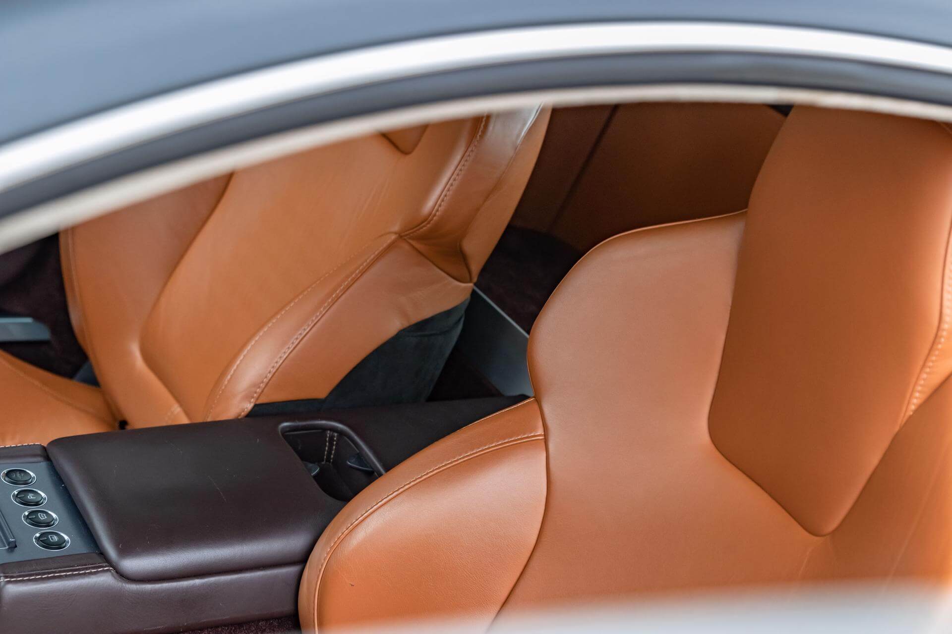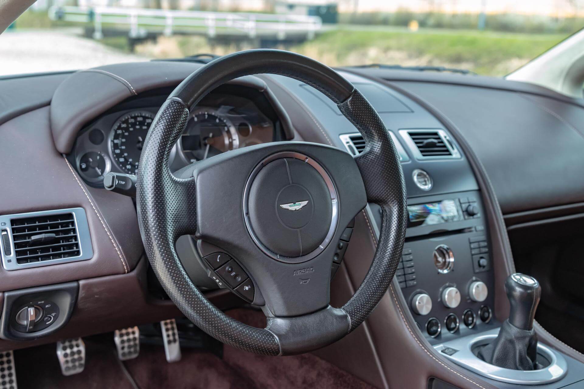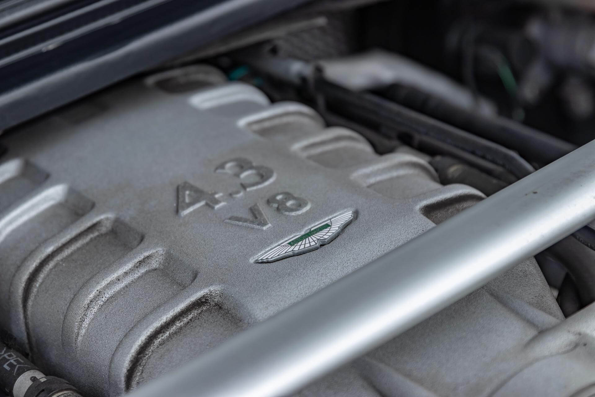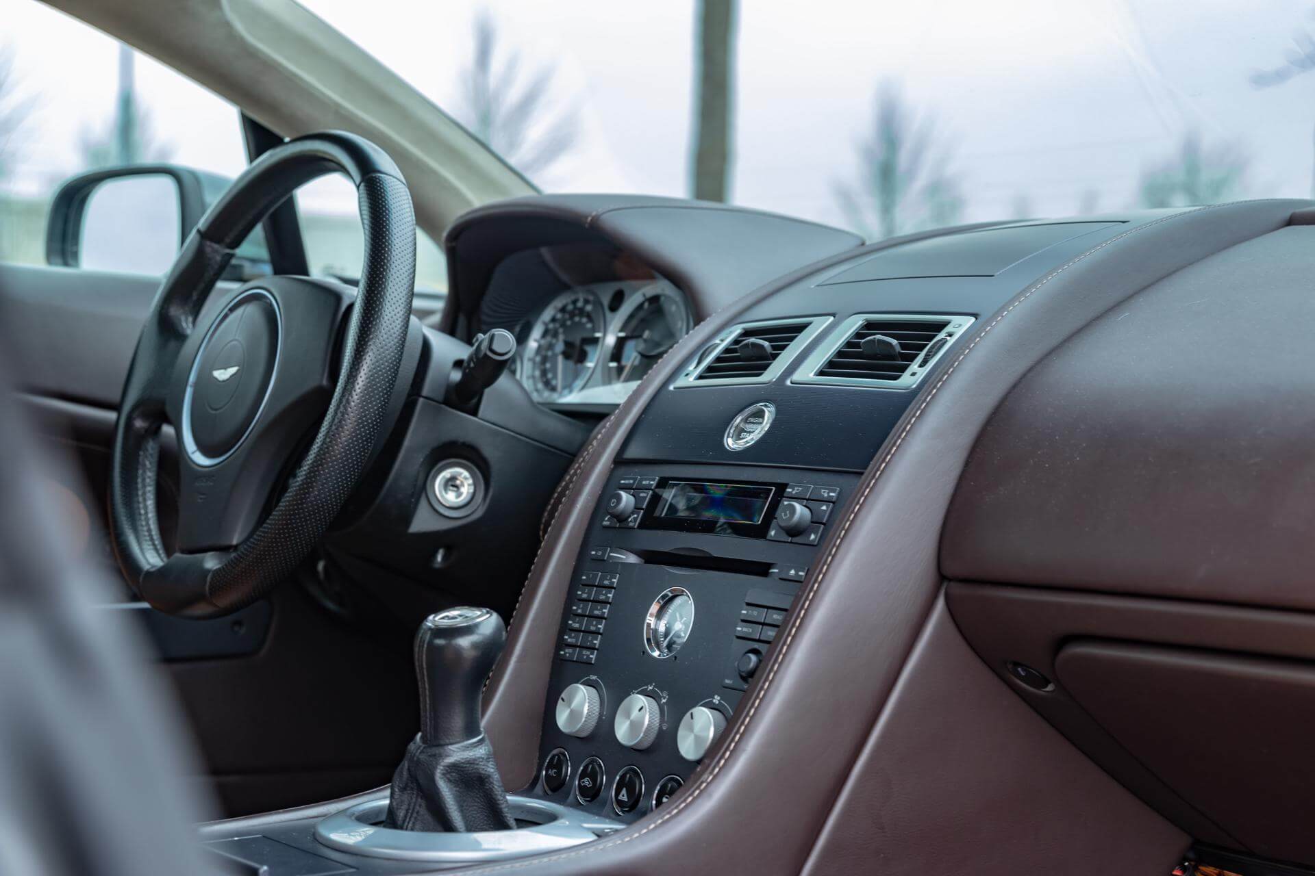 The Aston Martin V8 is tastefully combined in Meteorite Silver Metallic over a Bitter Chocolate and Kestrel Tan Leather interior.