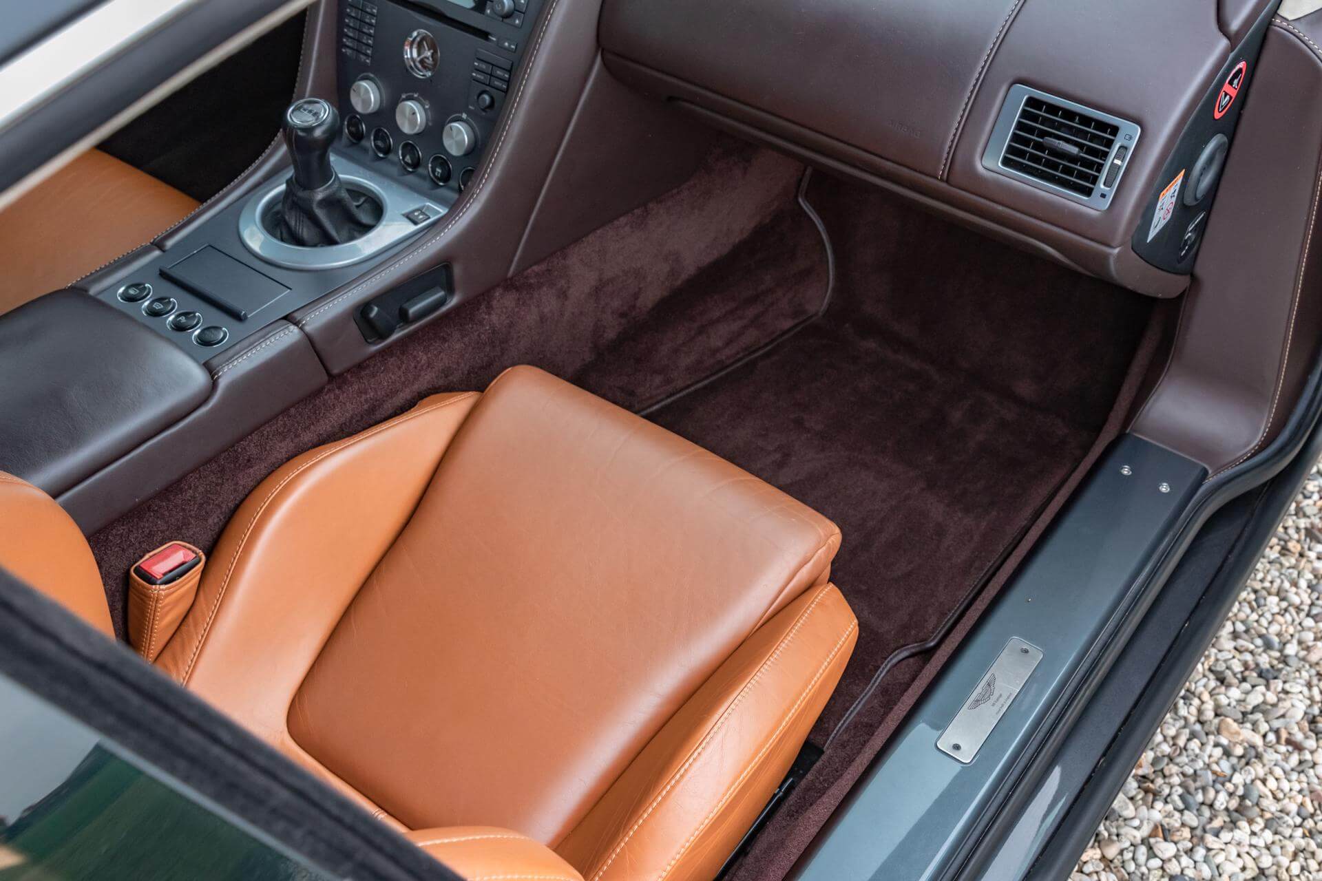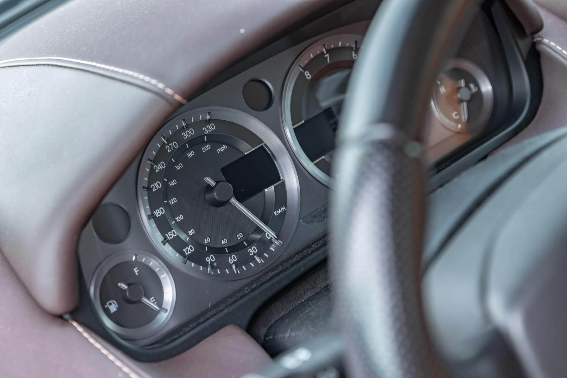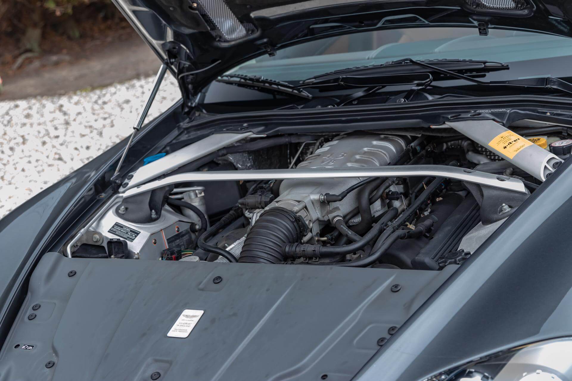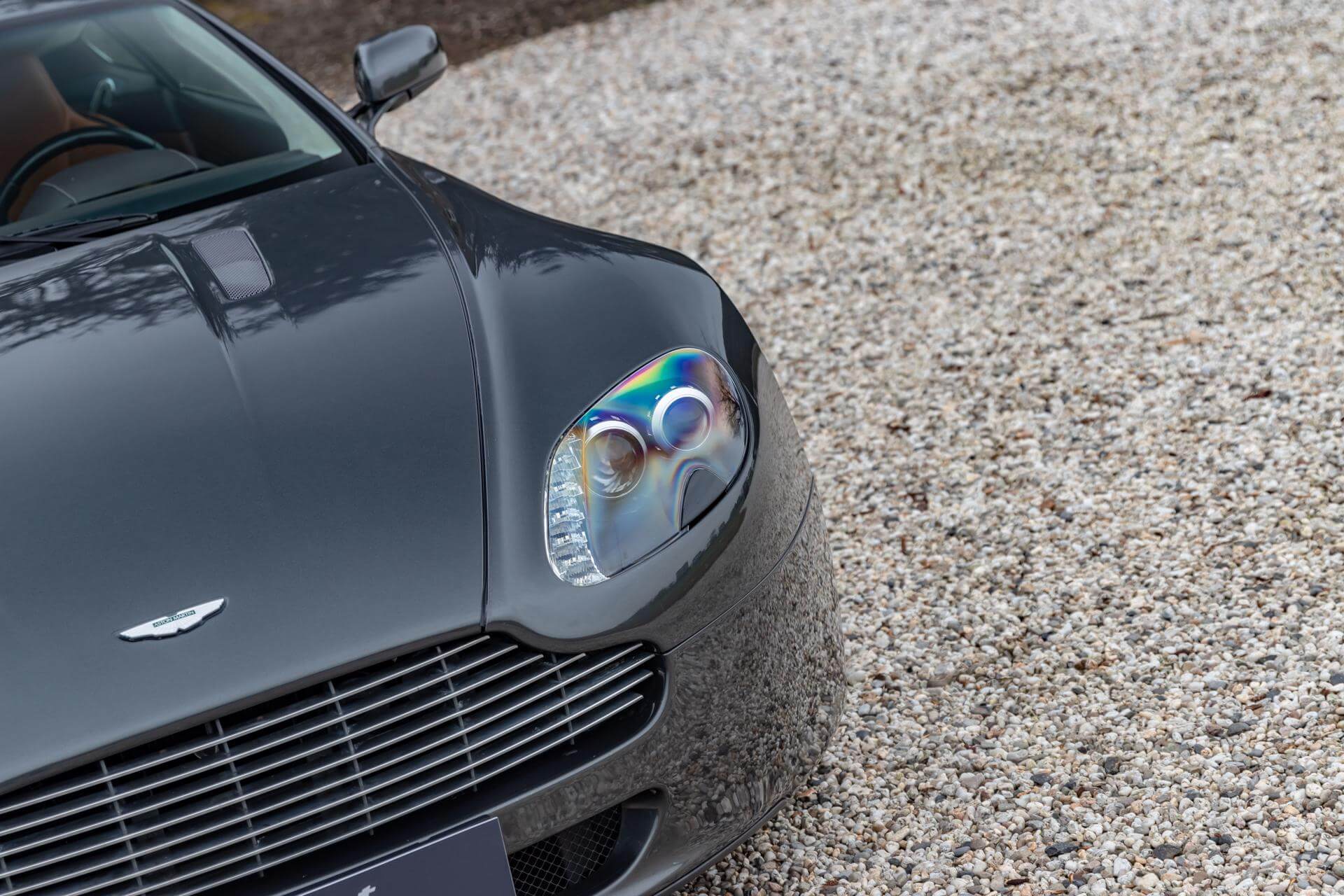 The Aston Martin V8 is tastefully combined in Meteorite Silver Metallic over a Bitter Chocolate and Kestrel Tan Leather interior.