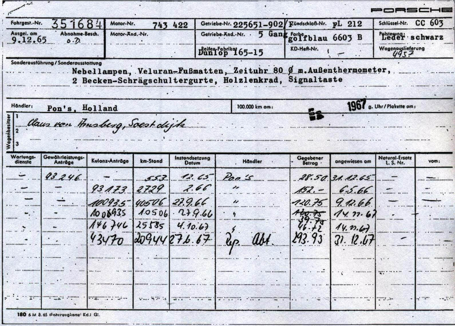 Originally configured in Gulfblau 6603 – reminiscent of the KLM Royal Dutch Airlines – Claus enjoyed the car for over two decades before selling it to a Mr. Grooters from Hengelo in September 1986. He serviced the car in March 1987 at 46.597 km. The car also received an undercoating treatment to prevent oxidation. Both the front and rear wings of the car were replaced, most likely in the 1980s.